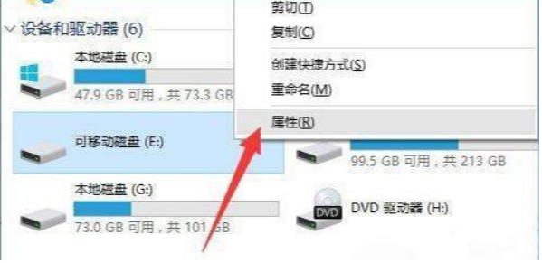 1、插入u盘,打开我的电脑,右击U盘盘符,在弹出的右键菜单中选择“属性”。