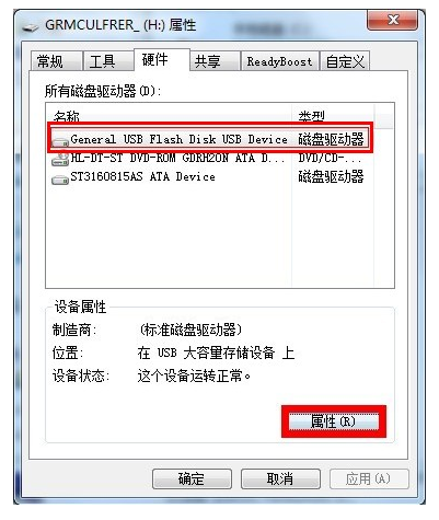 2、打开u盘属性窗口后,依次点击“硬件” - “属性”。