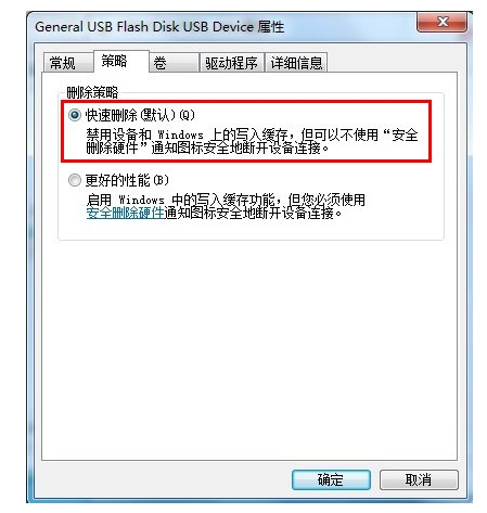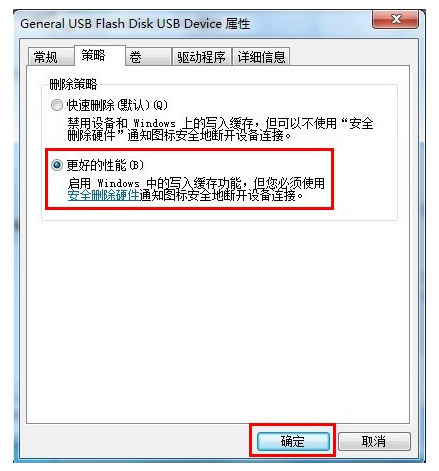 4、将策略改为“更好的性能”(xp系统则是“为提高性能而优化”)。这样就可以解决u盘被写保护的问题啦。
