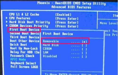 6、返回到Advanced BIOS Features窗口后,选择“First Boot Device”,即第一启动盘,回车,进入小窗口后,选择Removable或USB-HDD,都为U盘,选定后回车,最后按F10保存退出。