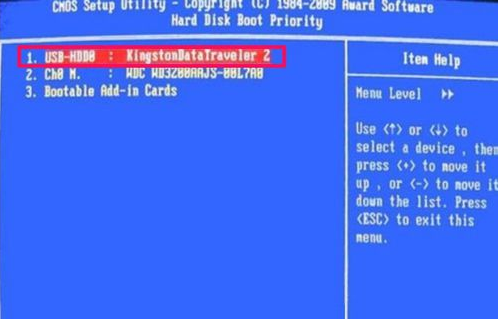 5、进入下一个窗口后,选择要优先启动的项,一般为USB-HDD,或者U盘的名称,用上下方向键选择项目,用“+”或“-”来移动到最上面,移好后,按Enter回车。