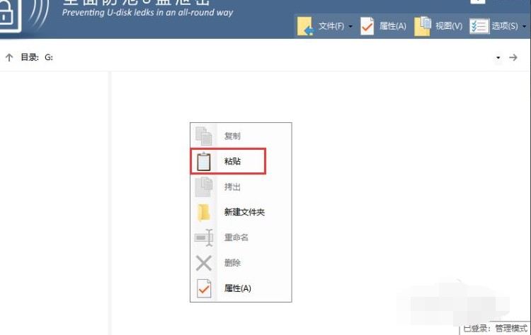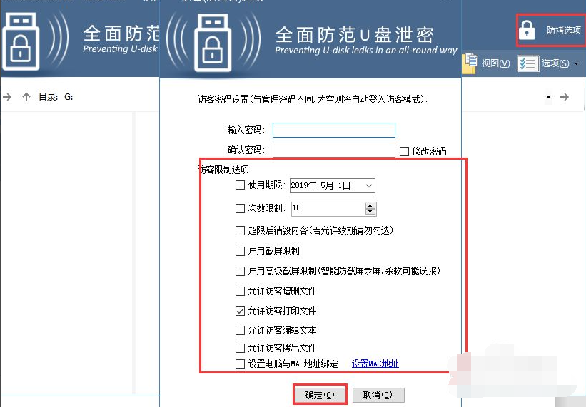 4、如果想要在普通模式下也可以对文件进行操作,那么在管理模式下右上角点击防拷选项,在弹出的窗口中根据需要选中对应的权限即可,最后点击确定。