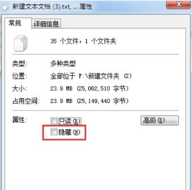 4.我们进入窗口后,清除勾选“隐藏”项,点击“确定”按钮,并在弹出的窗口中直接点击“确定”按钮即可恢复被隐藏的文件和文件夹。