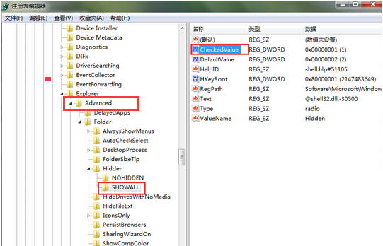 2.当我们进入到注册表编辑器页面之后,我们依次打开“HKEY_LOCAL_MACHINE→Software→Microsoft→Windows→CurrentVersion→explorer→Advan”,然后我们双击打开右侧窗口中的“CheckedValue”文件。