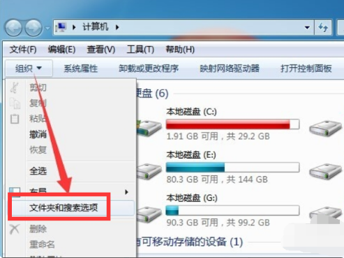1.我们打开“计算机”,点击“组织”下拉菜单,从中选择“文件夹和搜索选项”项。