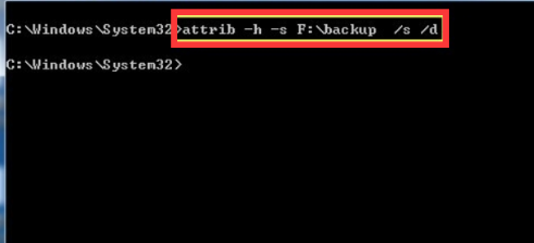 6.在命令提示符页面中,输入命令“attrib -h -s F:\backup /s /d"并按回车键即可将F盘(U盘盘符)中文件夹backup中的所有隐藏、系统文件属性删除掉。