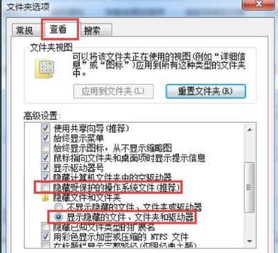 2.我们在弹出的窗口中,切换到“查看”选项,清除勾选“隐藏受保护的操作系统文件”,选择“显示隐藏的文件、文件夹和驱动”,点击“确定”完成设置。