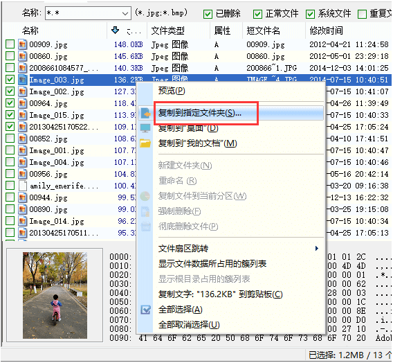 第五步:复制文件。将扫描出来的文件复制到其他的盘,完成U盘数据恢复过程。在软件中勾选需要的文件,然后点击鼠标右键并选择"复制到指定文件夹",之后就可以在电脑硬盘或是其他存储设备上新建立个文件夹来保存恢复的数据。