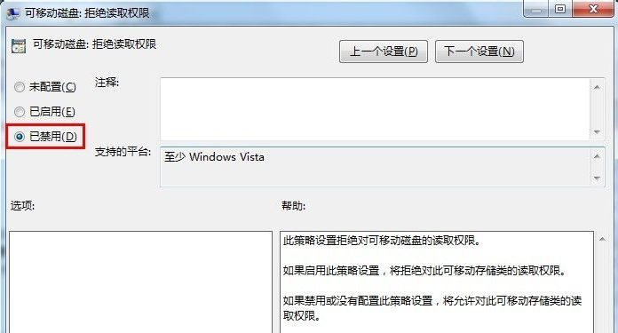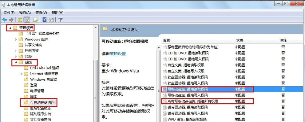 5、在组策略管事器窗口中,依次点击“管理模块”→“系统”→“可移动存储访问”,确保右侧“可移动磁盘:拒绝读取权限”和“所有可移动磁盘:拒绝读取权限”两项均被设置为“未配置”或“已禁用”。如果不是,则双击对应项,在弹出的窗口中勾选“已禁用”项并点击“确定”即可。