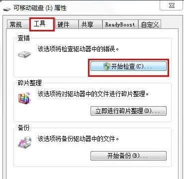 2、接着在打开的窗口中切换至“工具”选项卡,点击“查错 开始检查”按钮,在弹出的窗口中同时勾选两项,最后点击“开始”按钮来检查并修复磁盘错误。