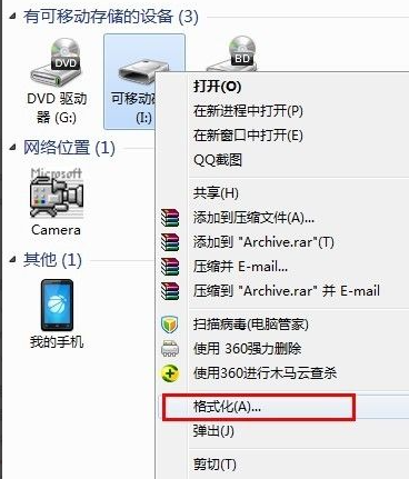 3、当以上方法无法打开U盘时,建议对U盘进行格式化操作。右击“可移动磁盘”,在弹出的右键菜单中选择“格式化”项。在打开的“格式化”窗口中,取消勾选“快速格式化”并点击“开始”按钮。