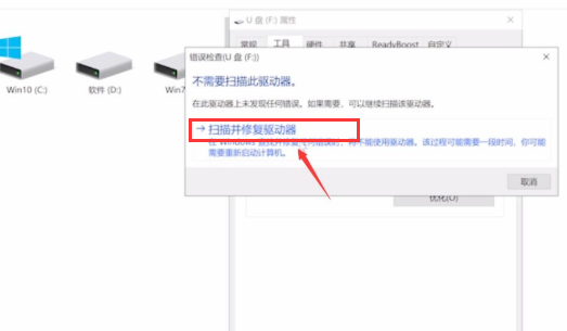 3.弹出窗口,我们选择"扫描并修复驱动器“当运行完成后,将此页面关闭,就可以删除u盘中的文件了。