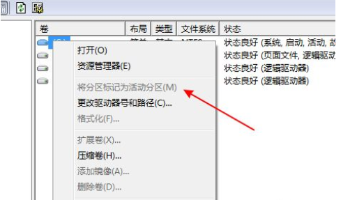 4.如果有则右击这个盘选择“将分区标识为活动分区”,再给磁盘取个名称。