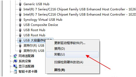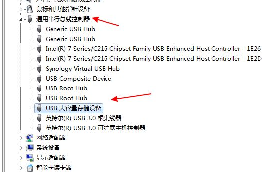 2、在设备列表中展开找到“USB大容量存储设备”。
