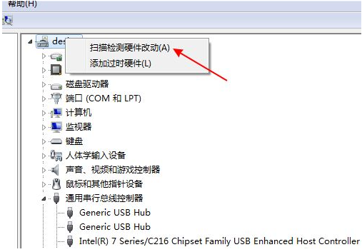 4、卸载完成后再右击顶上的计算机名,选择“扫描检测硬件改动”。