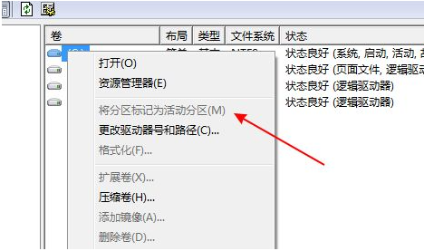 4、如果有则右击这个盘选择“将分区标识为活动分区”,再给磁盘取个名称。