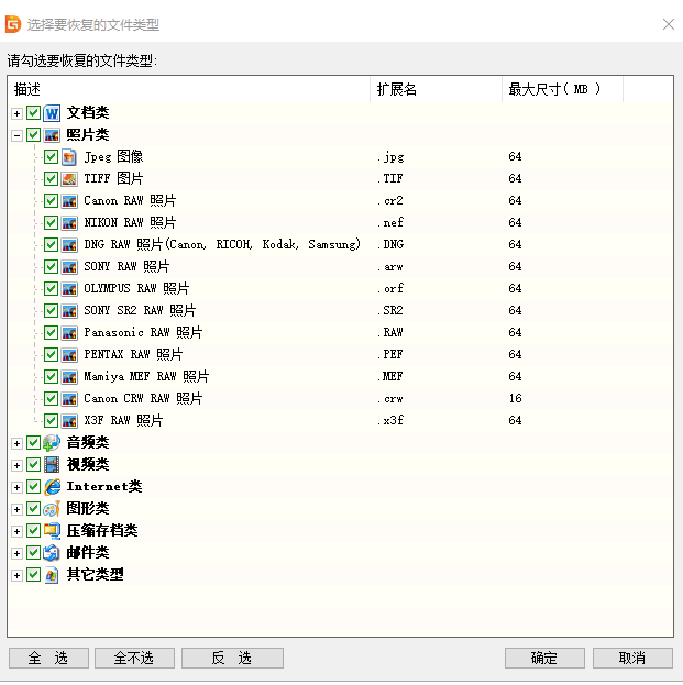 3.如果我们想自定义深度扫描时的文件类型,则可以点击"选择文件类型"按钮,然后勾选需要单独扫描的文件类型。