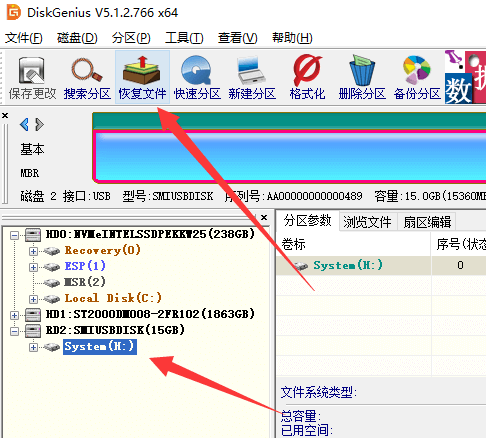 1.首先我们下载一个DG分区工具,将u盘插到电脑中,进入页面后,选择我们误删除文件的u盘,点击上方的“恢复文件”按钮。