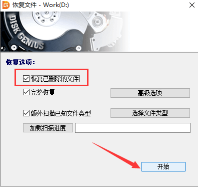 2.弹出窗口,我们点击"开始"按钮,进度扫描状态,"恢复已删除的文件"选项默认是勾选的,因此可以直接点击"开始"按钮即可。