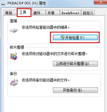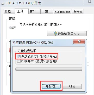 3.进入到开始检查页面后,在“自动修复文件系统错误”打勾,“开始”,完成后再返回u盘看看,原来删不掉的文件夹已经没有了。