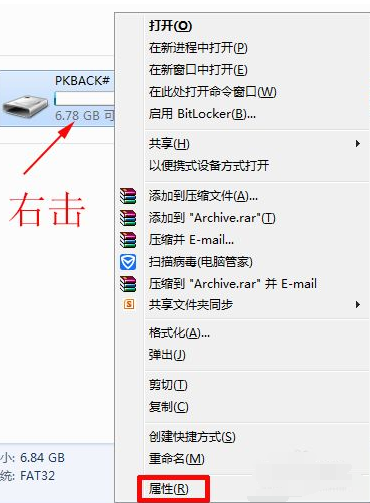 1.我们右键点击u盘选择”属性“。