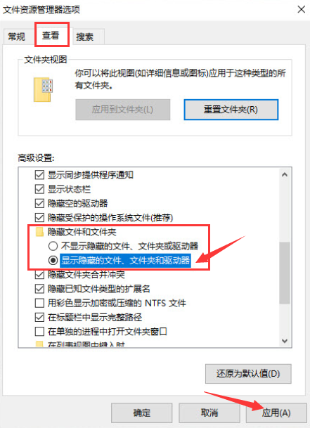 我们打开Windows“文件资源管理器”在页面中转到“工具”选项然后点击“文件夹”选项,在文件夹选项中点击“查看”选项,下方选中“显示隐藏的文件,文件夹和驱动器”。最后,单击“应用”。这将确保文件和文件夹未处于隐藏模式。