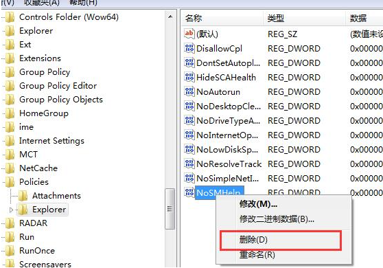 7、用户依次展开“HKEY_CURRENT_USER\Software\Microsoft\Windows\CurrentVersion\Policies\Explorer”,把“nodrives”键值删除掉即可。