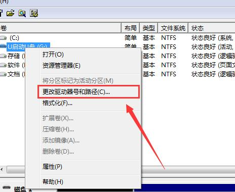 3、右键点击无法正常显示的u盘盘符,选择“更改驱动器和路径”的选项。