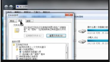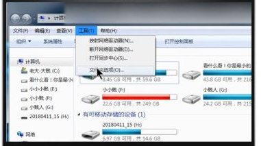 1.打开计算机,点击左上角“工具”,选择“文件夹选项”。
