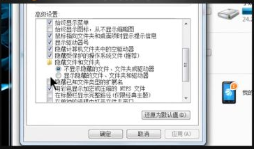 3.在高级设置下面找到隐藏文件和文件夹,选择启用显示隐藏的文件、文件夹和驱动器,点击“确定”即可。