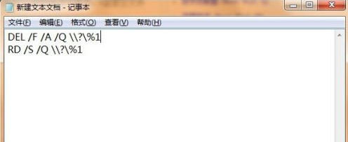 2.将命令“ DEL /F /A /Q \\?\%1”和“RD /S /Q \\?\%1 ”写入文本中。