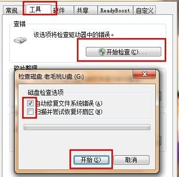 3.在页面中点击上方的“工具”,选择“开始检查”,然后我们将“自动修复文件系统错误”和“扫描并试图恢复坏扇区”都选上后点“开始”按钮。