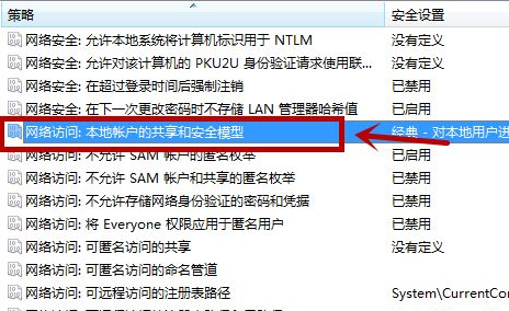 7、之后我们在里面仔细的找一下,点击”网络访问:本地账户的共享和安全模型”选项。