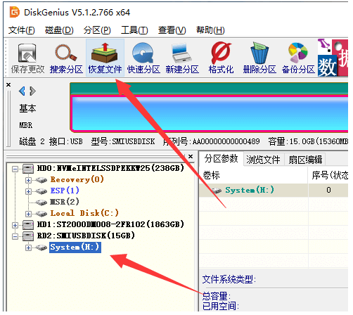 第二步:在DiskGenius软件中选择丢失数据的U盘,然后点击软件上方的"恢复文件"按钮。