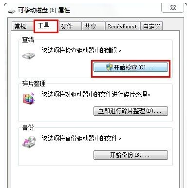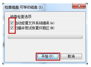 2.接着在打开的窗口中切换至“工具”选项卡,点击“查错 开始检查”按钮,在弹出的窗口中同时勾选两项,最后点击“开始”按钮来检查并修复磁盘错误。