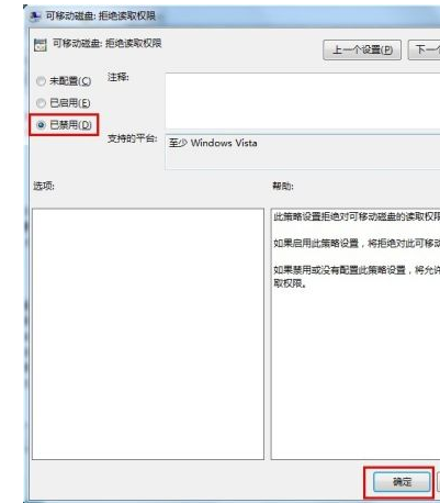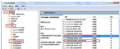 5.在组策略管事器窗口中,依次点击“管理模块”→“系统”→“可移动存储访问”,确保右侧“可移动磁盘:拒绝读取权限”和“所有可移动磁盘:拒绝读取权限”两项均被设置为“未配置”或“已禁用”。如果不是,则双击对应项,在弹出的窗口中勾选“已禁用”项并点击“确定”即可。