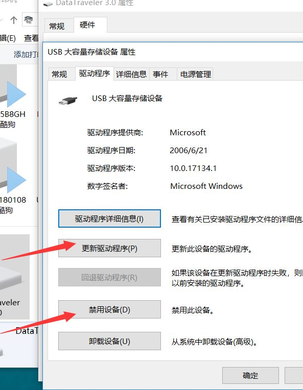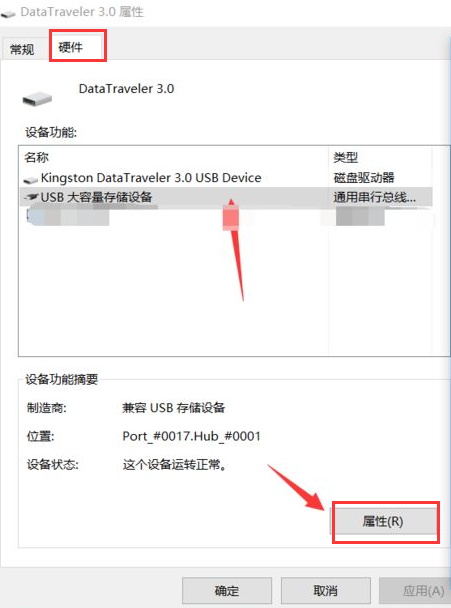 5.在属性页面中,我们选择“硬件”选项,找到USB大容量存储设备,然后点击“属性”。