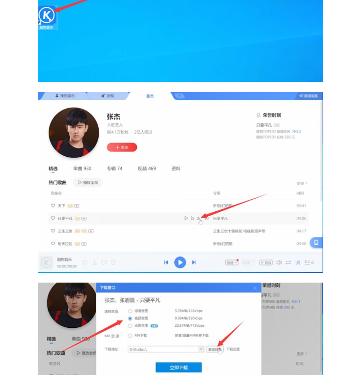 1.首先在电脑上面打开酷狗音乐,选择自己喜欢的音乐点击下载,然后点击更改目录,更改目录为u盘。如图所示: