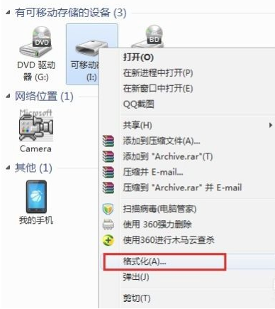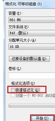 3.当以上方法无法打开U盘时,建议对U盘进行格式化操作。右击“可移动磁盘”,在弹出的右键菜单中选择“格式化”项。在打开的“格式化”窗口中,取消勾选“快速格式化”并点击“开始”按钮。