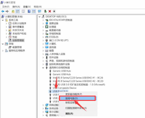 3.在下方找到任意一个USB Root Hub并右键单击它,选择“禁用设备“。