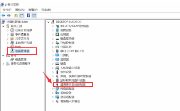 2.打开计算机管理器后,我们点击“设备管理器”,在右侧展开通用串行总线控制器。