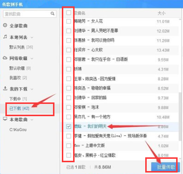 6.在页面中我们选择已下载,在中间的部分找到需要下载的歌曲,在前面打勾,点击“批量传歌”按钮。