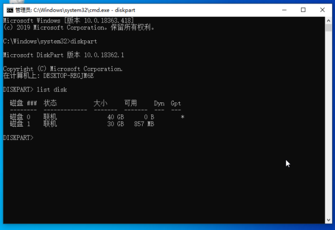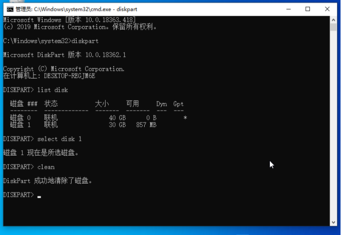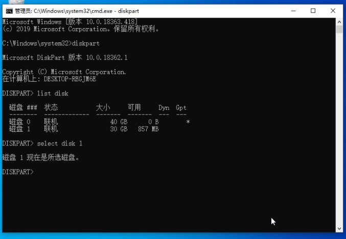 5、这里输入并回车执行 select disk 1 命令,也就是选择当前30GB大小的U盘。