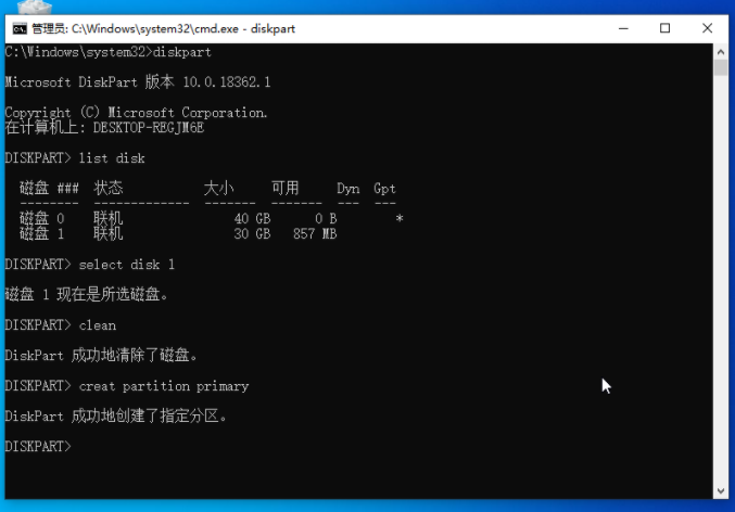 7、再输入并回车执行 creat partition primary 创建主分区命令。