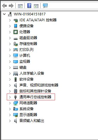 3.在设备管理器的主页面,找到“通用串行总线控制器”并点开。