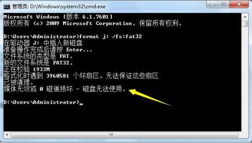 2、接着输入“format j: /fs:fat32”(其中j代表U盘所在盘符)并按回车键执行U盘格式化操作;如图所示: