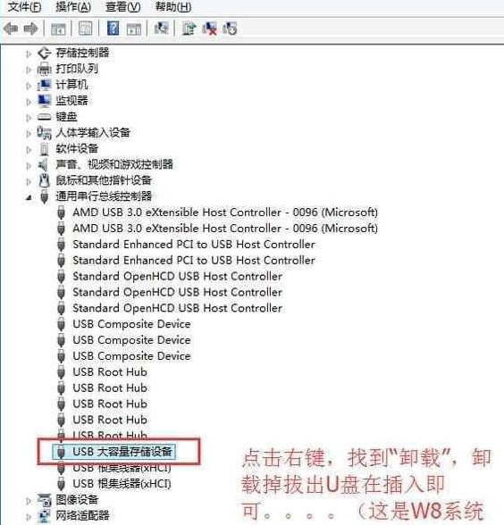 3.我们直接下载一个驱动人生,然后自动扫描一下驱动,点击更新usb驱动就修复好了,如果没有黄色感叹号,那我们也可以尝试鼠标右键点击USB大容量存储设备,然后点击卸载,然后我们再把U盘重新拔插一次,看看是不是显示U盘了呢。