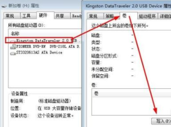 然后在出现的属性窗口中硬件里在自己U盘上双击,然后找到新窗口的写入。