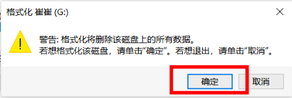 6.会弹出警告框我们不用理,只需要点击“确定”按钮即可开始将U盘格式化为NTFS格式。