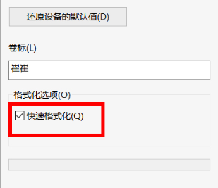 4.最后我们将下方格式化选项的“快速格式化"勾选上。
